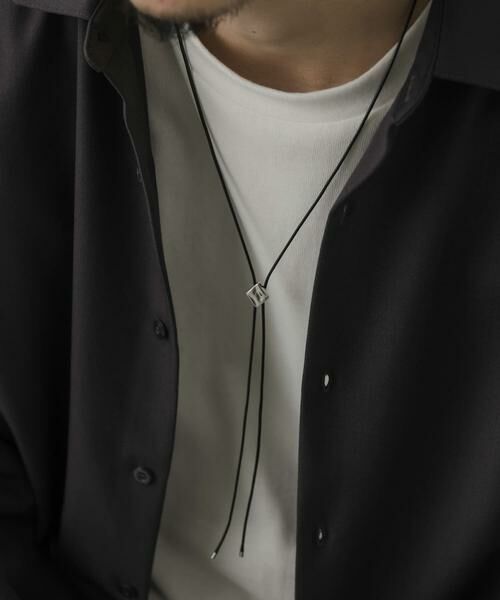 スリムなコードと表面感のあるスクエア型のメタルパーツが好バランスな印象のネックレス。