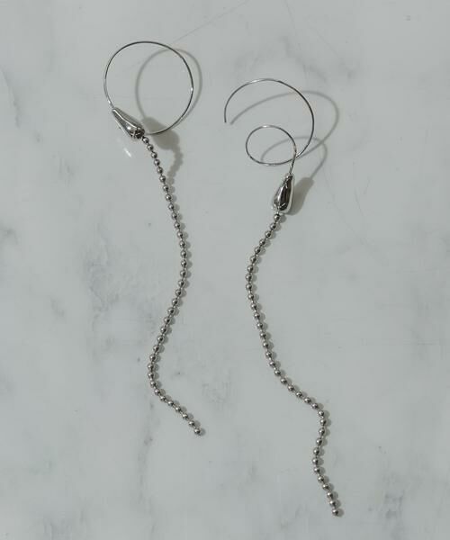 フックデザインを左右で異なるアシンメトリーにすることで、シンプルながらニュアンスの効いたルックスに仕立てたピアス。