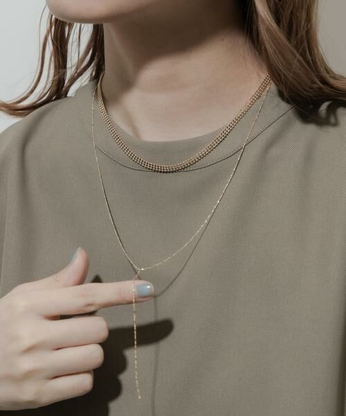 メタルボールで仕立てた3ラインデザインの太めのショートネックレスと華奢なチェーンで仕立てたシンプルなY字ネックレスの2セット。