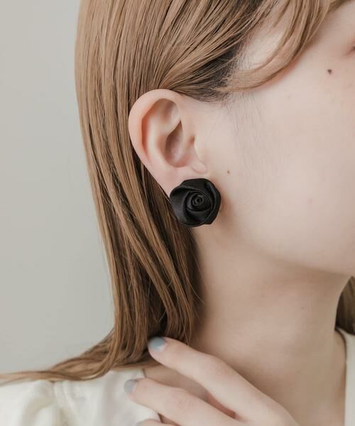 注目のローズモチーフを、ピアスでもご用意。耳元にさり気なくトレンドを取り入れるだけで、旬のスタイリングが完成します。カラーはブラックを採用しているので、甘めにも辛めにもコーディネートできます。