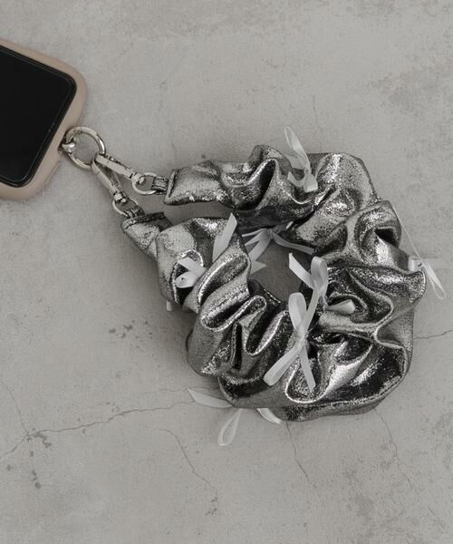 パッと目を引くボリューミーなシュシュにフェミニンなリボンをあしらったトレンド感のあるルックスが可愛いハンドストラップ。