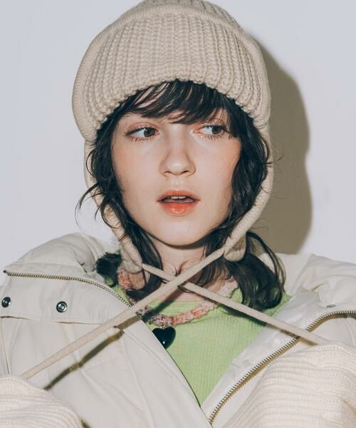 上で結んだ状態だとスッキリとまとまり、フラップを降ろして着用すれば耳周りも暖かく秋冬らしい印象に。