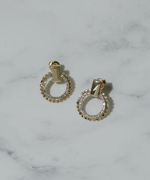肌なじみの良いゴールドメタルにミニサイズのクリアビジューが映えるサークルシルエットのピアス。