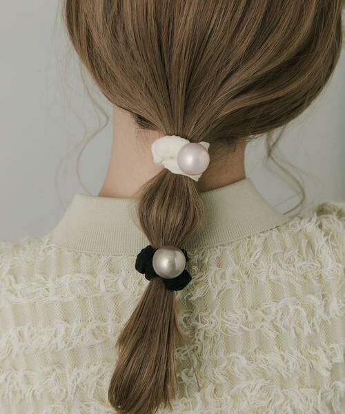 マシュマロのような生地をクシュっとさせたヘアゴムにくすみがかったニュアンスが目を引くメタルボールを施しました。