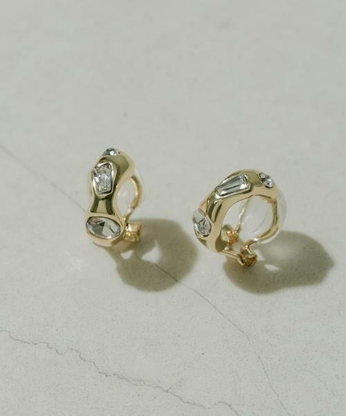 ニュアンスを効かせたイビツなシルエットと、多彩なカッティングを施したクリアビジューをランダムに散りばめた遊び心のあるデザインが魅力。