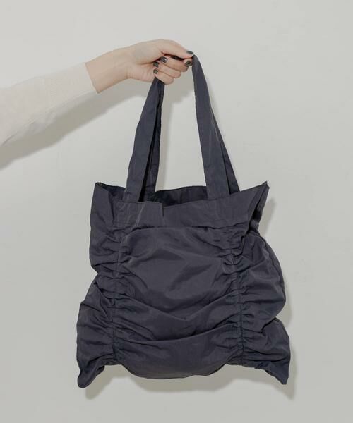 くしゅくしゅとしたギャザーのデザインが映えるナイロン素材のトートバッグ。