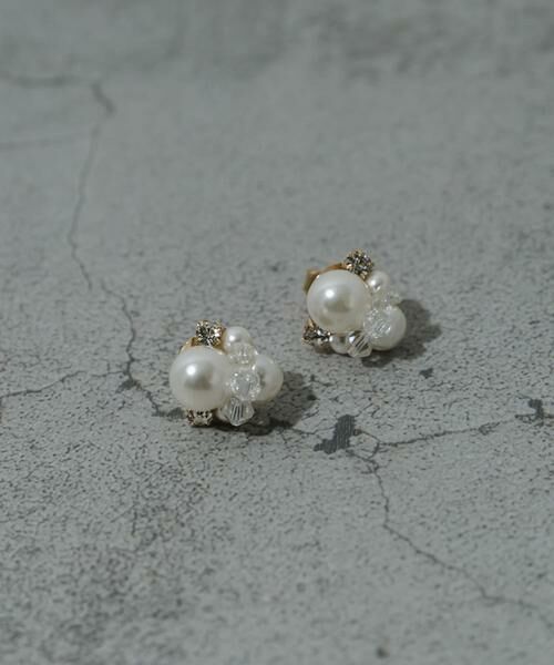 パール・ビジュー・クリアビーズの異素材パーツが組み合わさったミニピアス。