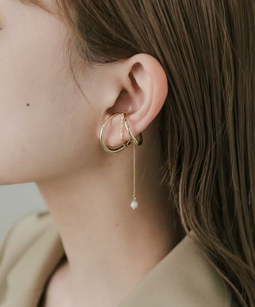 メタルラインが重なりあった存在感あるイヤーカフに、揺れるミニパールが目を惹くチェーンをプラス。