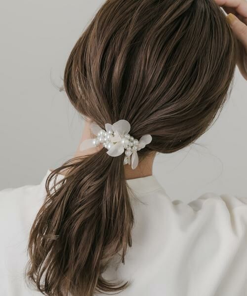 ぎゅっと集まったパールに、シアー素材の花びらモチーフを添えたヘアゴム。
