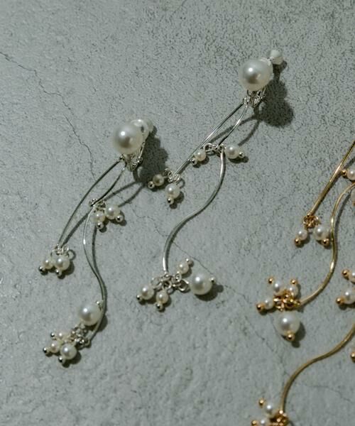 カーブを描いたメタルバーにミニパールが連なったデザインのロングイヤリング。