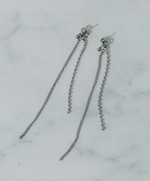 異なる種類のチェーンが2本垂れ下がるロングピアス。