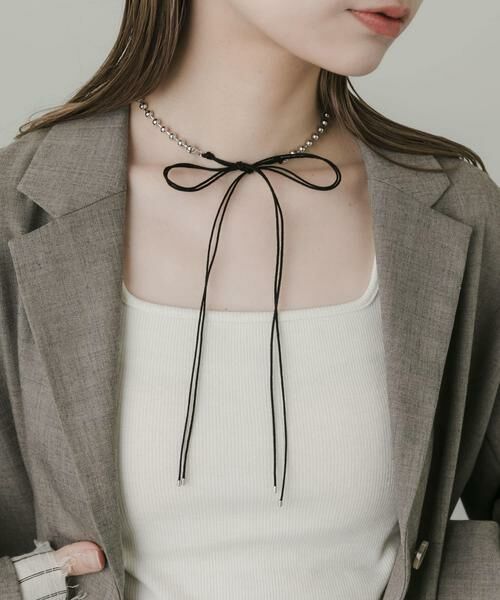 シルバーのボールチェーンと、ブラックのコードを組み合わせたネックレス。異素材の組み合わせが都会的な雰囲気で、コーディネートに取り入れることでぐっと引き締まった印象に。