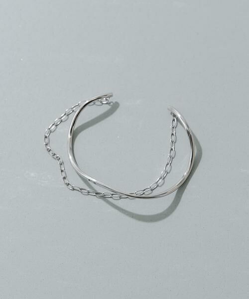 スッキリとしたシンプルなフォルムのメタルバングルに、スリムチェーンが付いた重ね付け風デザインのバングル。