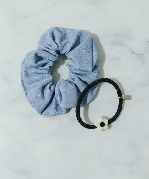 デニム素材のシュシュとフラワーモチーフがワンポイントのヘアゴムをセットでご用意。