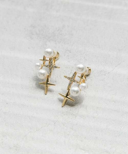 トレンドのスターモチーフの周りにパールやビジューをあしらった華やかなデザインのイヤリング。