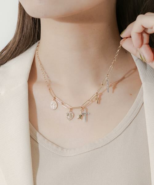 コイン、クロス、スターなど、様々なモチーフチャームが連なった遊び心あふれるネックレスが登場。