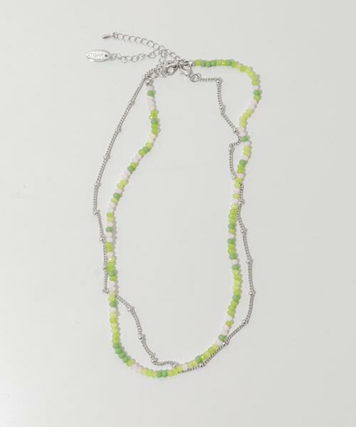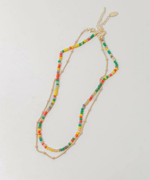 様々なカラーのビーズと華奢なチェーンが組み合わさった、レイヤードデザインのネックレス。