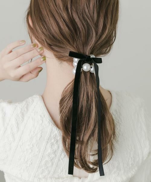 大粒パールがにベロア素材のリボンを組み合わせた、印象的なデザインのヘアゴム。