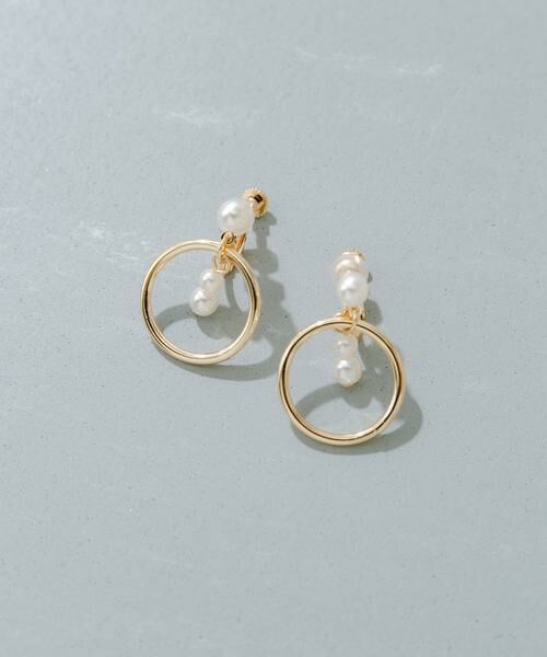 サークル型のメタルパーツの中心にミニサイズのパールが揺れる、思わず目を惹くデザインのイヤリング。