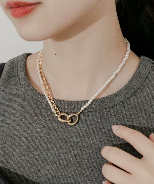 パールとチェーンを組み合わせた、異素材ミックスデザインのショートネックレス。