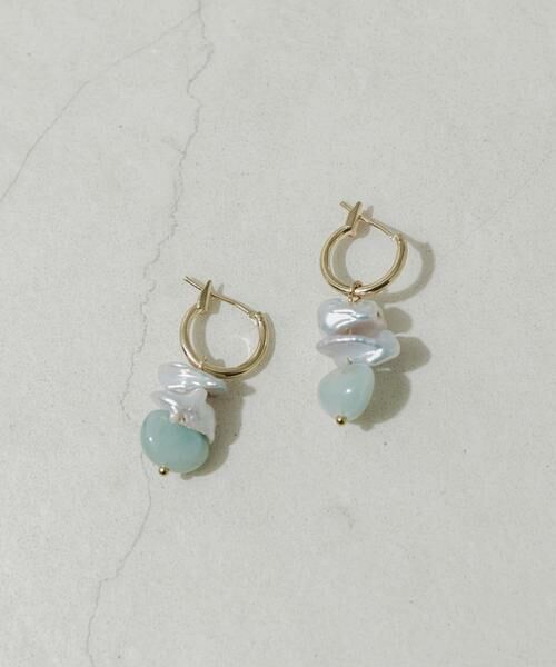 いびつな形の淡水パールと柔らかなライトブルーのストーンを組み合わせた、爽やかな雰囲気のアイテム。