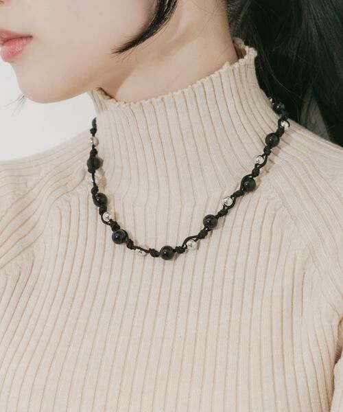 ブラックのビーズとメタルボールをロープに通しながら編み込んだような、デザイン性あるネックレス。