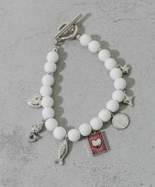連なったホワイトのボールに、ハート、マーメイド、コインなど個性的なチャームが加わったブレスレット。