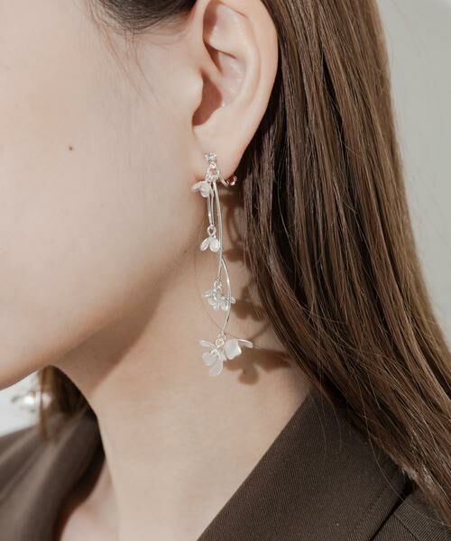 ウェーブを描いたメタルラインに、フラワーモチーフが連なったロングイヤリング。