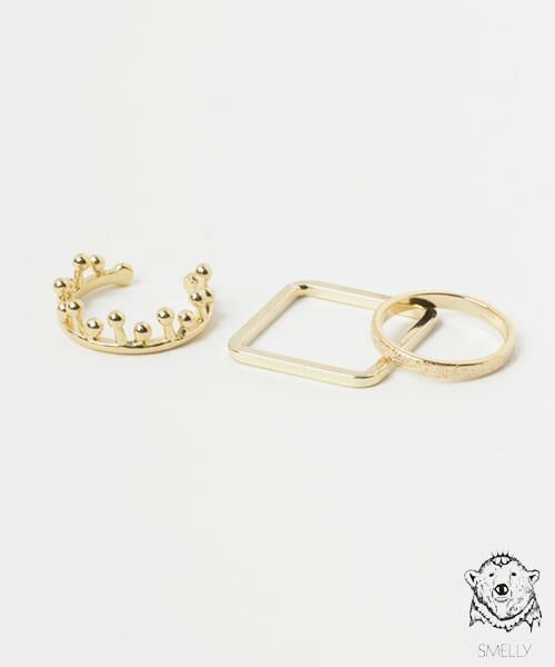 デザインの異なる3本リングセット。同じ指に重ねてつけてもよし、バラバラの指につけたり単品でつかったり、気分に合わせて楽しんでいただけます。 ※ メッキ製品は変色してしまいがちです。こまめなお手入れで防止してください。アレルギー体質の方や体調が低下している方など、かぶれることがありますので十分にご注意ください。※ その他お取り扱いに関しましては、商品に付属のアテンションタグをご覧下さい。サイズ:one=4, 5, 9号