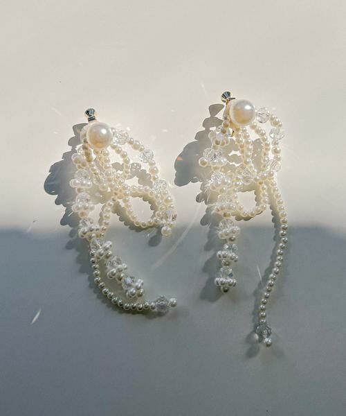 パールとクリアビーズをたっぷり施した、シャワーのような落ち感のあるシルエットが目を引くイヤリング。