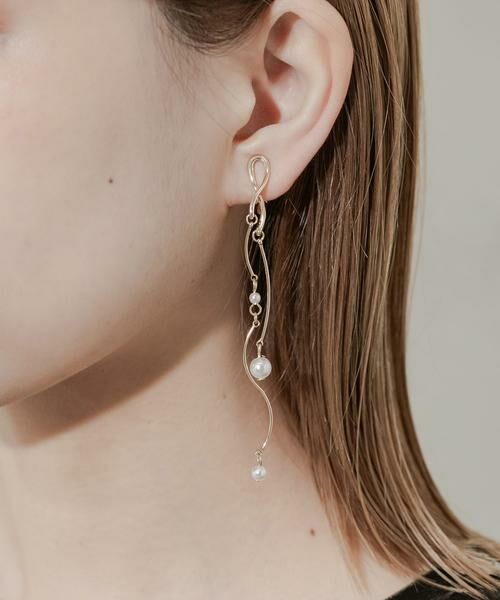 ウェーブを描いたメタルラインとミニパールが、耳元で豊かな表情を見せてくれるロングイヤリング。