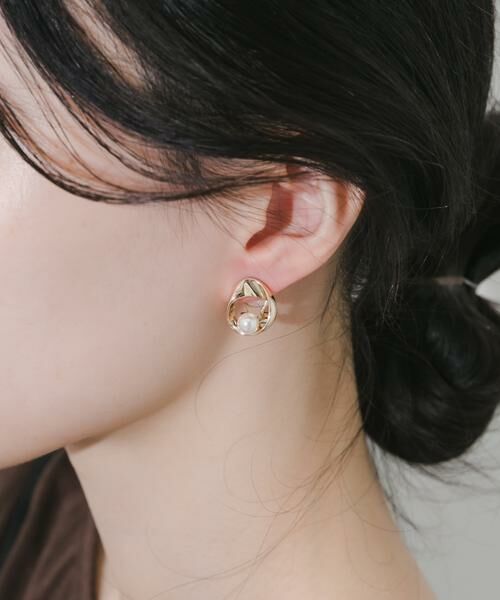 ニュアンスのあるメタルフレームの中に、一粒のパールを閉じ込めたデザインのイヤリング。