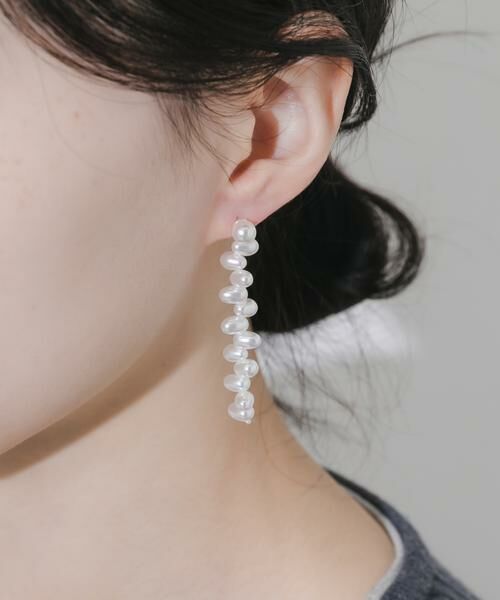 オーバル型のパールを縦に繋いだ表情豊かなデザインが目を惹くロングピアス。