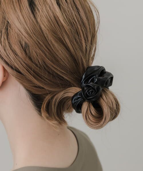 薔薇のモチーフを採用したシュシュをご用意。ローズの甘い雰囲気と、フェイクレザーのクールな質感が好バランス。ガーリーさの中にスパイスが効いたデザインに仕上がっています。