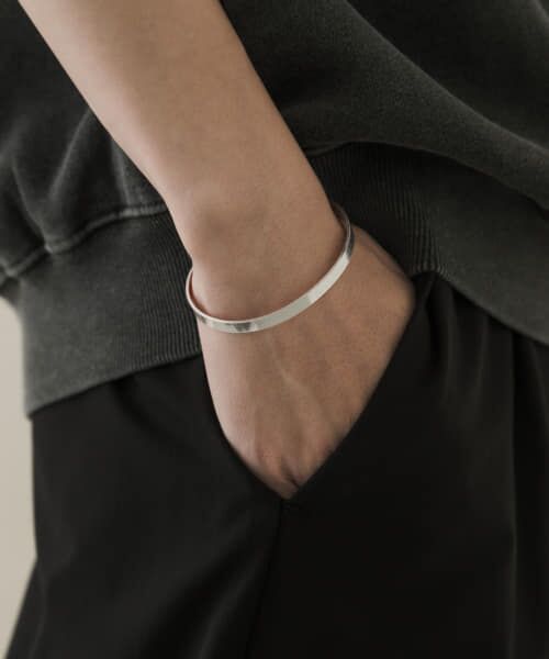 細身で腕時計やお手持ちのブレスレットなどとの相性も良いシンプルなメタルバングル。