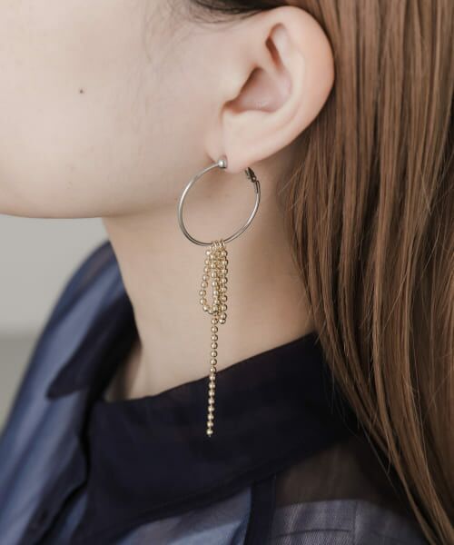 シンプルなフープイヤリングにボールチェーンのを施したロングデザインのイヤリング。
