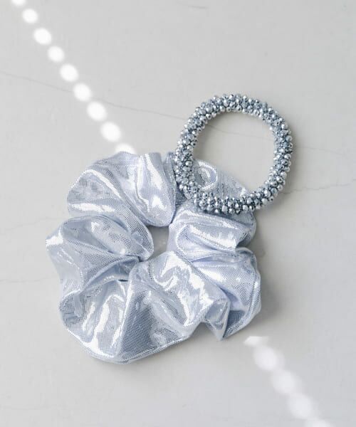 柔らかいメタリック素材を採用したシュシュと、ぎっしりと敷き詰められたビーズがキラキラ輝くヘアゴムを2点セットでご用意。