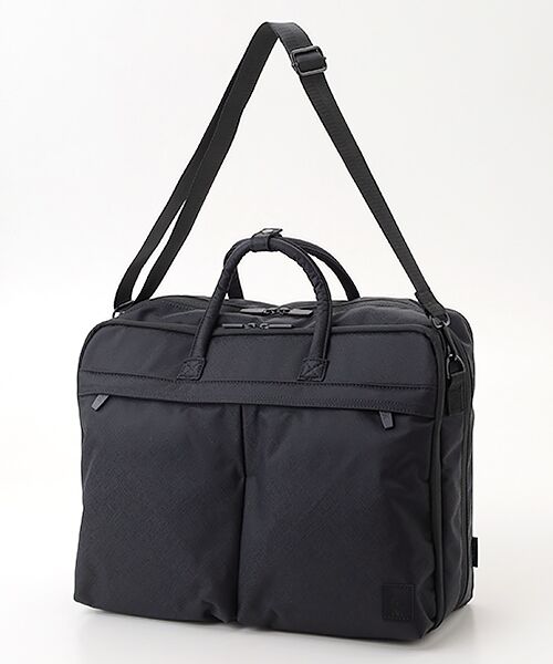 軽量で撥水性に優れたナイロン生地の裏面に PVC加工を施すことにより耐久性、防水性効果を向上させています。サフィアーノレザーの様な型押し加工をジャガード織で表現することで立体感を出し、ビジネスシーンにマッチする上品さも兼ね揃えています。