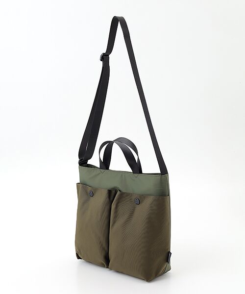 フィドロックのマグネットパーツを使用したフロントポケットと、ボディーの素材が切り替えが特徴のデザインの2WAY BAGです。程よいサイズ感で、メインバッグとしも、サブバックとしても使用できます。内側両サイドにはボトル収納・傘収納用ポケットがついておりすっきりと綺麗に使用ができます。