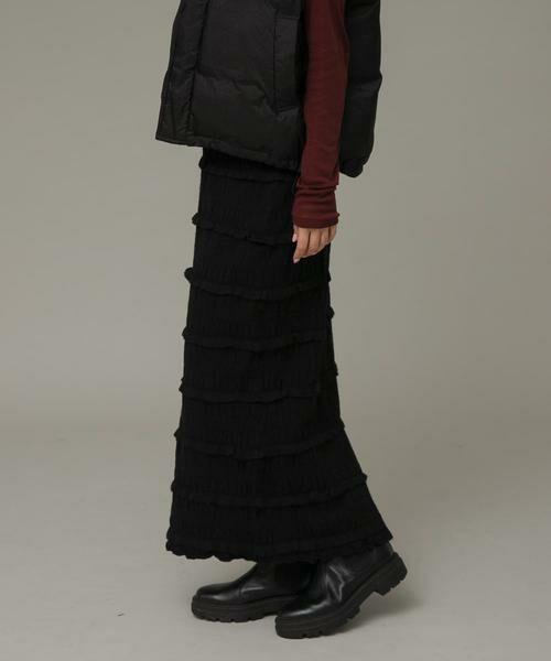 編地切替やフリル部分のディティールにこだわり、大人かわいいニットスカートに仕上げました。