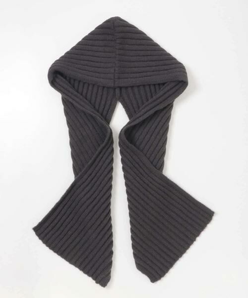 起毛感のあるふわふわの糸で編み立てたフード付きマフラー。