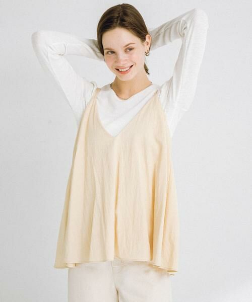 深めのVネックや裾にむかって広がるフレアシルエットが新鮮な一着。