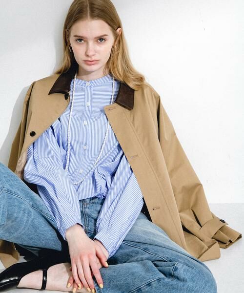 フェイクレザーの衿がポイントになったミドル丈ジャケット