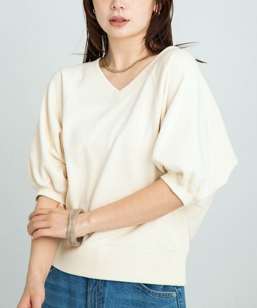 Vネックですっきり着痩せが叶う、ボリュームのある袖がポイントのスウェットTシャツ。