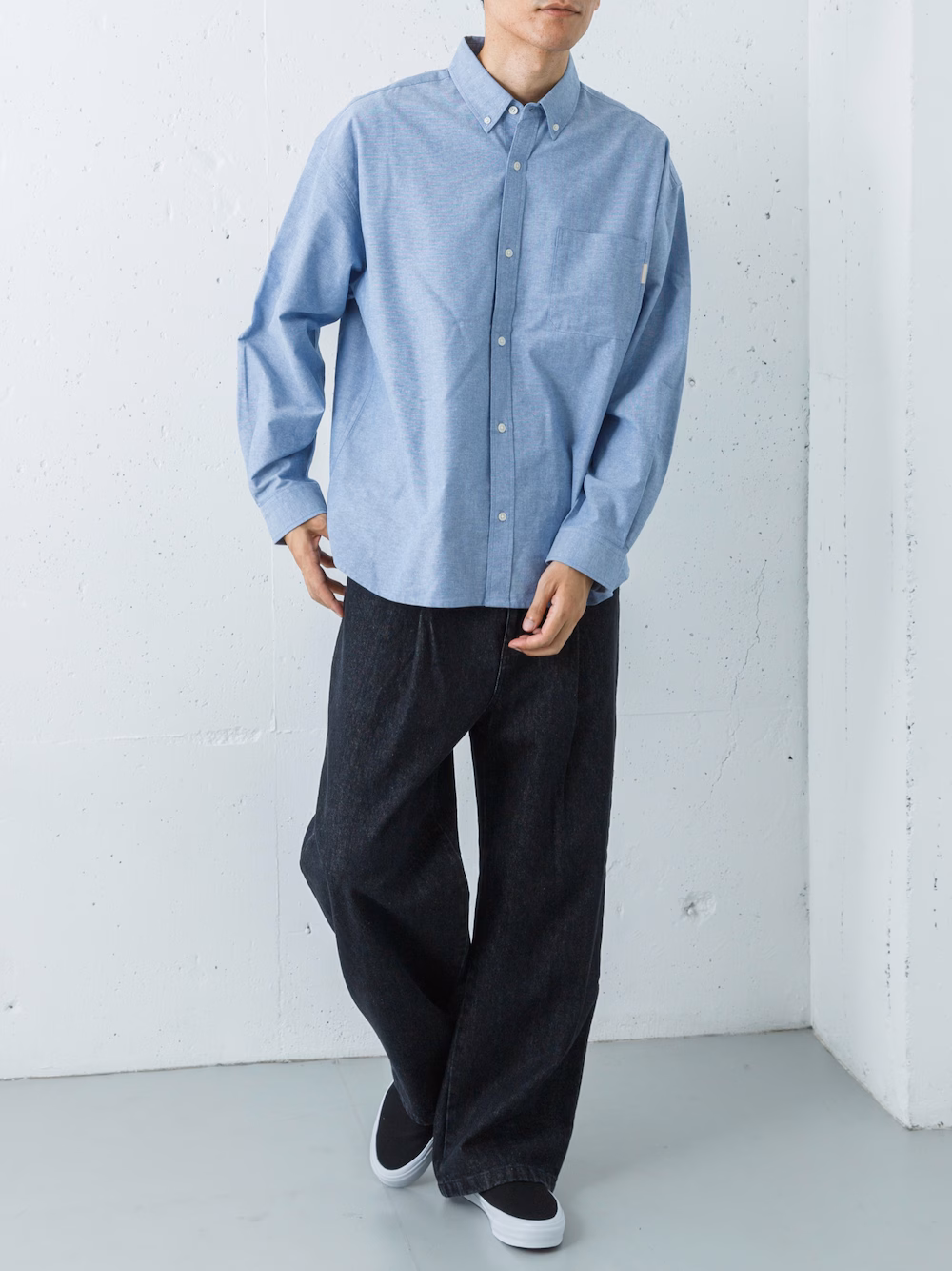 オックスシャツは、清潔感とリラックス感を兼ね備えたオーバーシルエットが魅力。 別注RED KAPデニムは、タック入りで上品さがあり、ラフすぎない印象に仕上がります。 シャツのクリーンさとデニムのワーク感が合わさり、大人の抜け感あるカジュアルスタイルにおすすめです。
