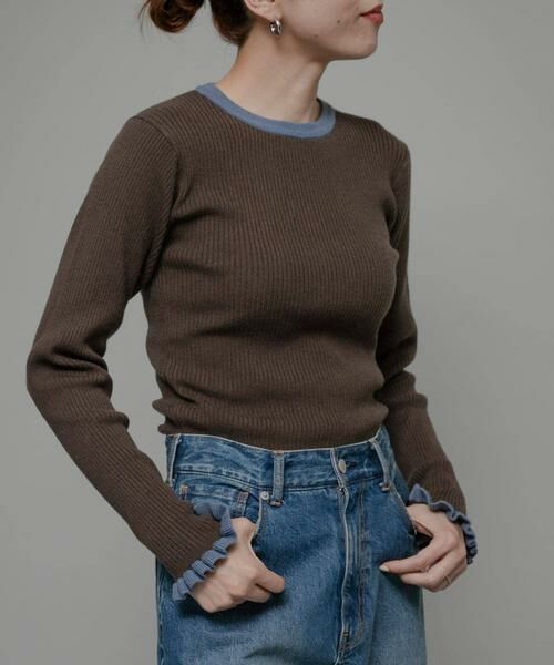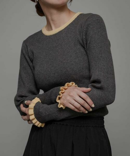 襟ぐりと袖口のバイカラーフリルがポイントのリブニット。