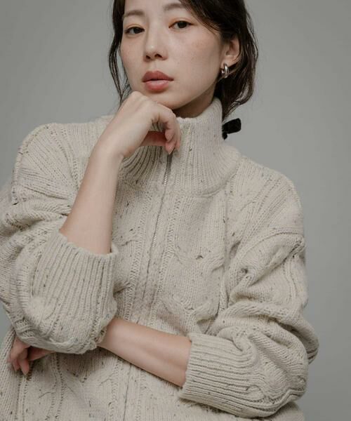 立体感のあるケーブル編みを施し、首元はすっきりとしたスタンドカラーでカジュアルながらも高見えするデザインに仕上げました。