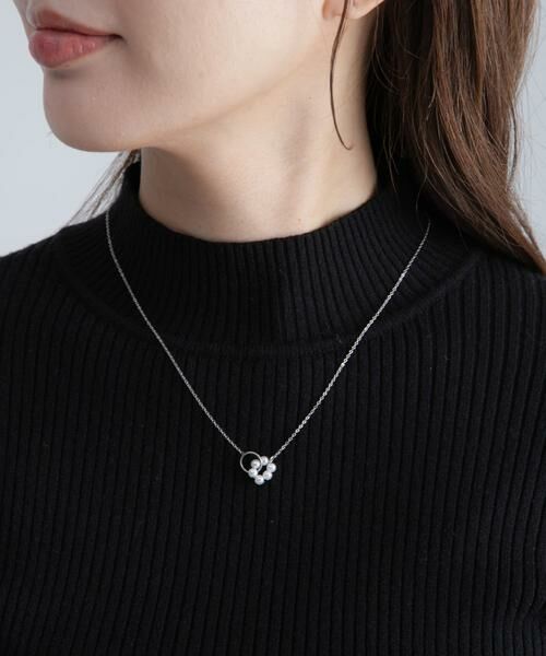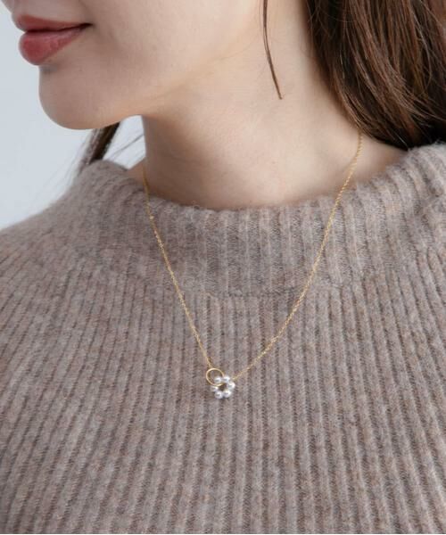 パールが並んだまるでお花のようなモチーフとメタルのリングがつらなった、シンプルながらも女性らしいデザイン。