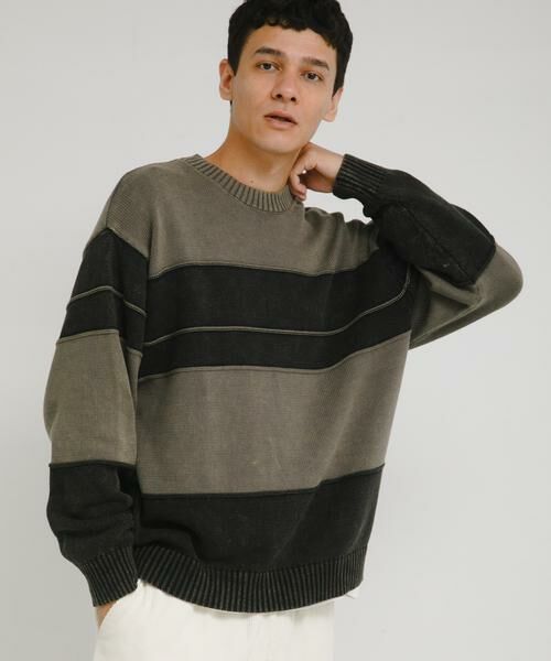 ヴィンテージライクな風合いが魅力の、ピグメント加工を施したニットです。パネル切り替えのボーダーデザインは、単調になりがちな秋冬のコーディネートにアクセントを加えてくれます。程よい厚みの生地感で、一枚でも暖かく、アウターのインナーとしても着ぶくれしません。リラックス感のあるシルエットで、肩の力を抜いた大人のカジュアルスタイルが完成します。