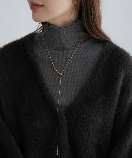 ボールモチーフ部分につながるチェーンで長さの調整ができ、合わせるお洋服とのバランスによって見え方を変えることができます。